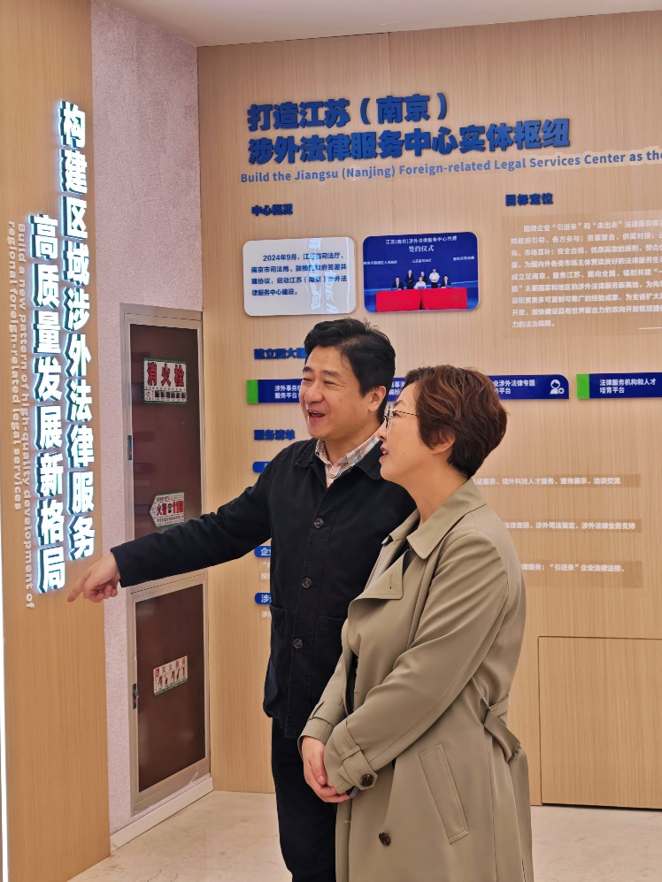 活动首站,法顾委委员参访了江苏(南京)涉外法律服务中心,详细了解了中心涉外事务综合咨询、国际商事海事争议多元解纷、企业涉外法律专题服务、涉外法律服务人才培训等功能作用,与中心负责同志就侨企侨商面临的境外法律风险等问题开展交流。